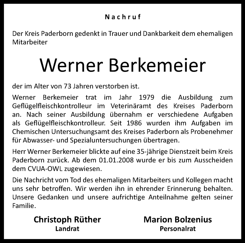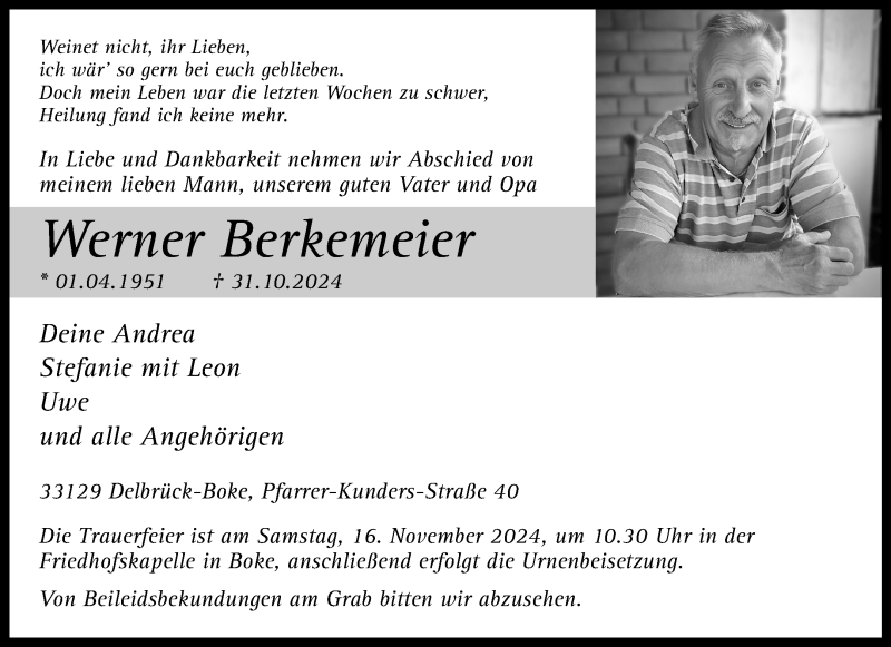 Hier finden Sie alle Traueranzeigen aus der Zeitung, die bisher für Werner Berkemeier erschienen sind. Weitere Traueranzeigen, die in der Zeitung erscheinen, werden hier ebenfalls aufgelistet