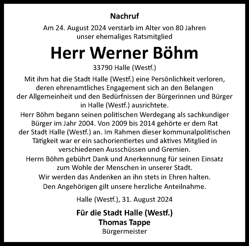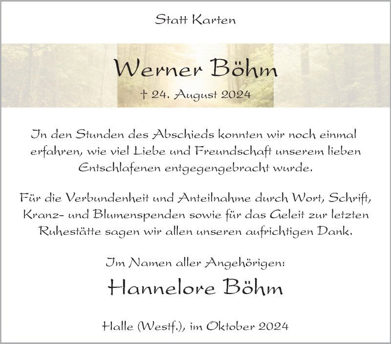 Hier finden Sie alle Traueranzeigen aus der Zeitung, die bisher für Werner Böhm erschienen sind. Weitere Traueranzeigen, die in der Zeitung erscheinen, werden hier ebenfalls aufgelistet