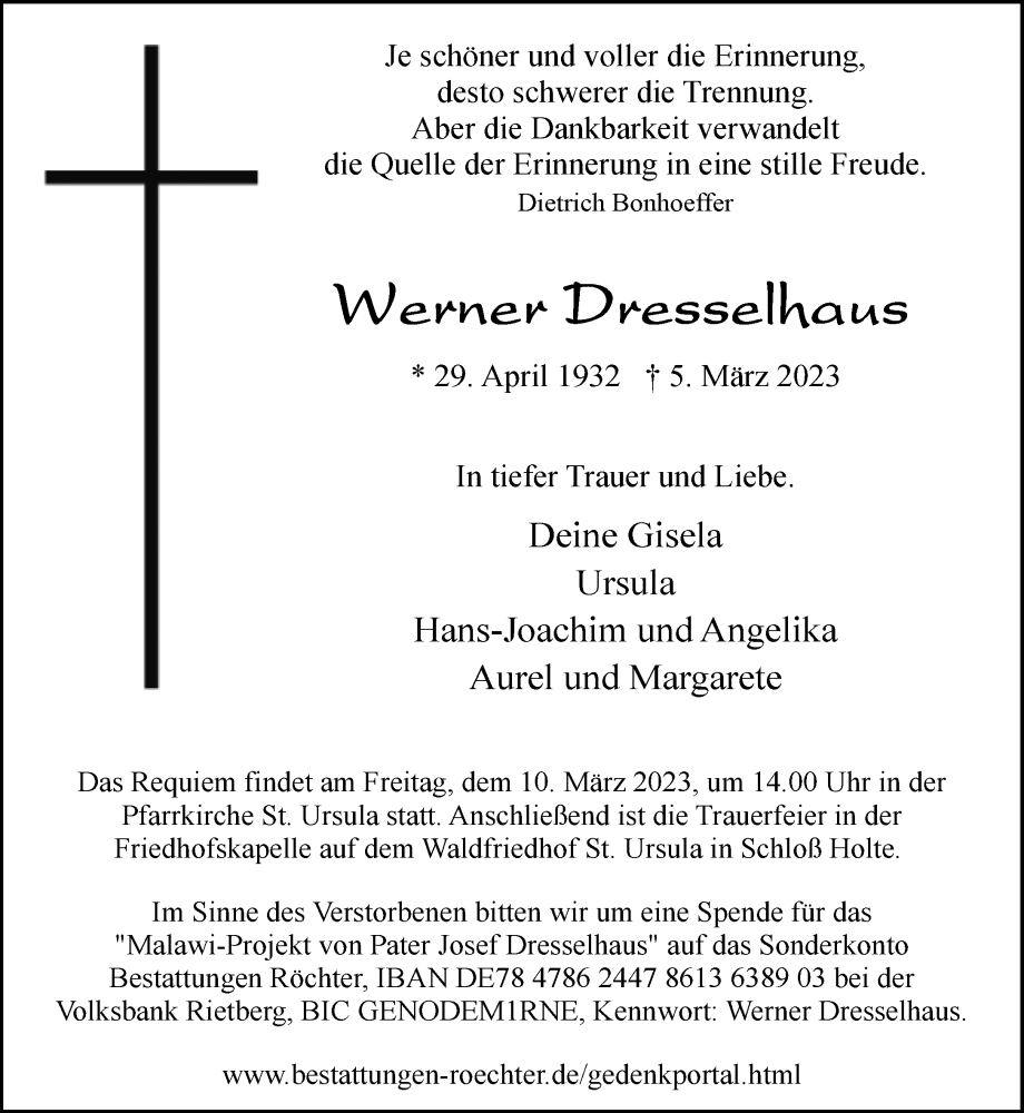 Hier finden Sie alle Traueranzeigen aus der Zeitung, die bisher für Werner Dresselhaus erschienen sind. Weitere Traueranzeigen, die in der Zeitung erscheinen, werden hier ebenfalls aufgelistet