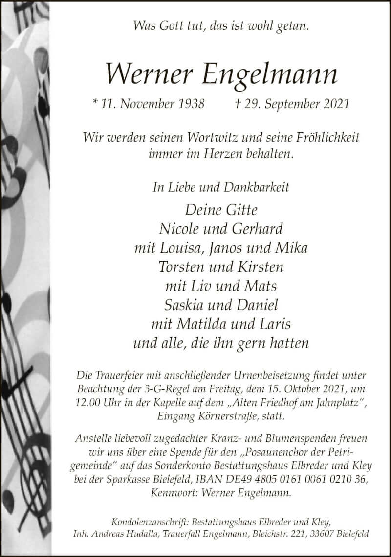 Hier finden Sie alle Traueranzeigen aus der Zeitung, die bisher für Werner Engelmann erschienen sind. Weitere Traueranzeigen, die in der Zeitung erscheinen, werden hier ebenfalls aufgelistet
