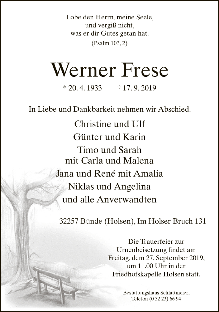 Hier finden Sie alle Traueranzeigen aus der Zeitung, die bisher für Werner Frese erschienen sind. Weitere Traueranzeigen, die in der Zeitung erscheinen, werden hier ebenfalls aufgelistet