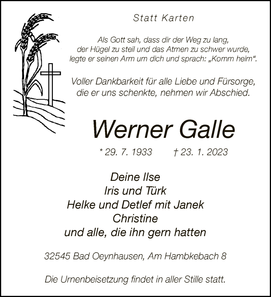 Hier finden Sie alle Traueranzeigen aus der Zeitung, die bisher für Werner Galle erschienen sind. Weitere Traueranzeigen, die in der Zeitung erscheinen, werden hier ebenfalls aufgelistet