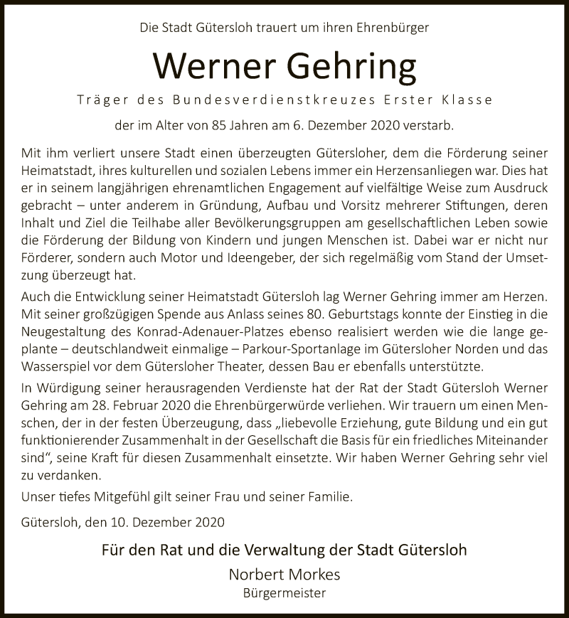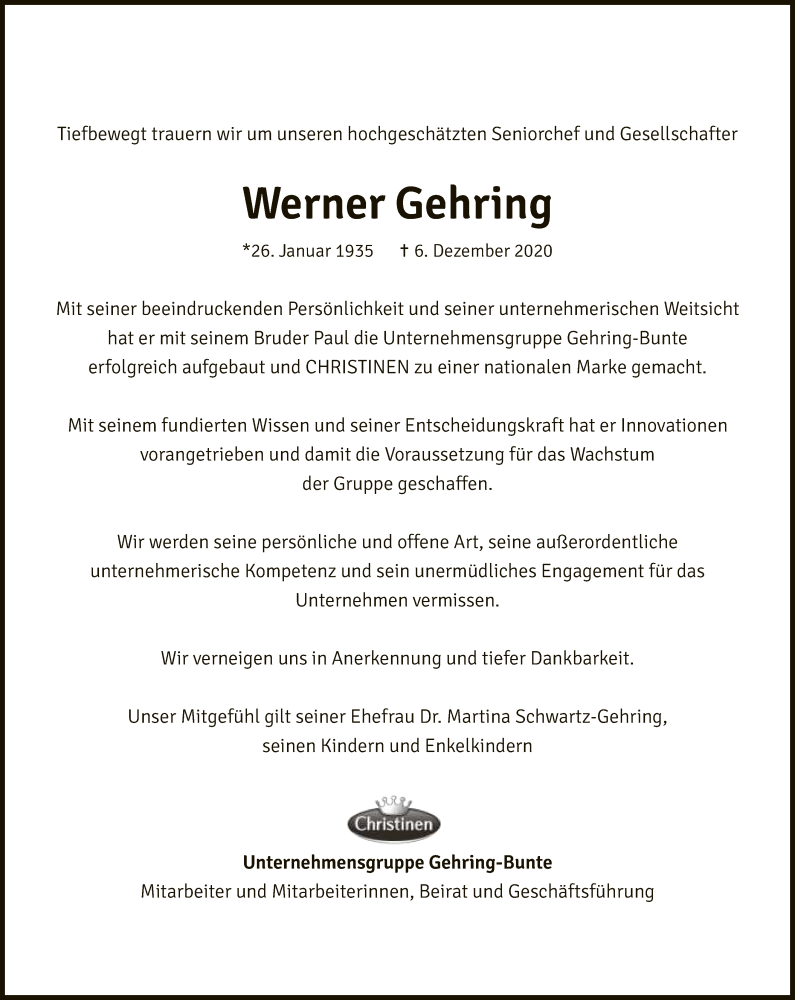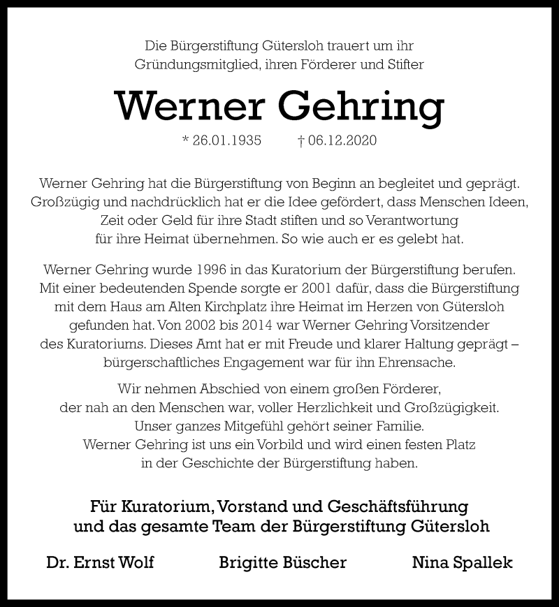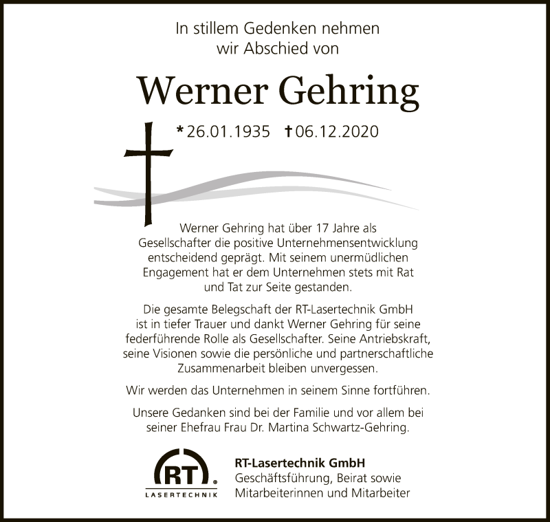 Hier finden Sie alle Traueranzeigen aus der Zeitung, die bisher für Werner Gehring erschienen sind. Weitere Traueranzeigen, die in der Zeitung erscheinen, werden hier ebenfalls aufgelistet