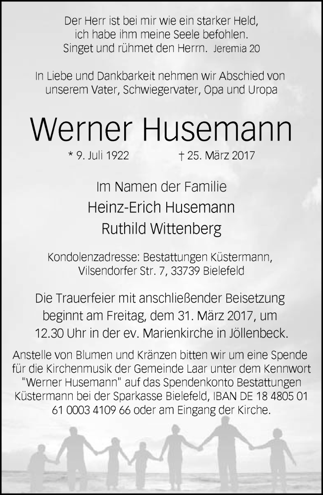 Hier finden Sie alle Traueranzeigen aus der Zeitung, die bisher für Werner Husemann erschienen sind. Weitere Traueranzeigen, die in der Zeitung erscheinen, werden hier ebenfalls aufgelistet
