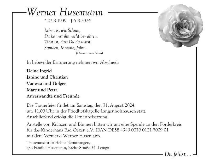Hier finden Sie alle Traueranzeigen aus der Zeitung, die bisher für Werner Husemann erschienen sind. Weitere Traueranzeigen, die in der Zeitung erscheinen, werden hier ebenfalls aufgelistet