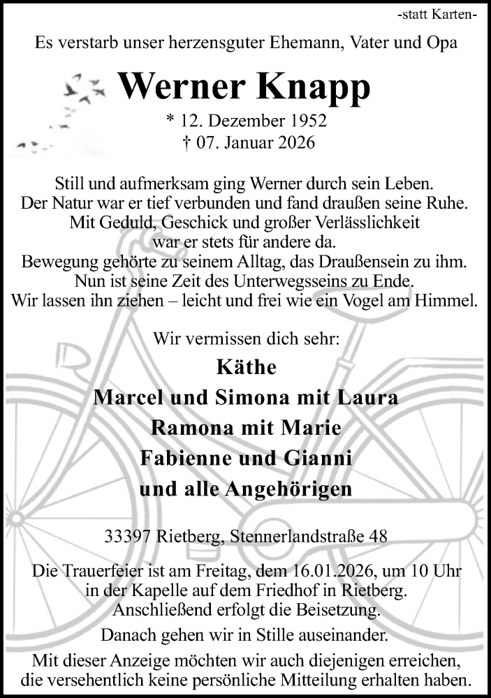 Hier finden Sie alle Traueranzeigen aus der Zeitung, die bisher für Werner Knapp erschienen sind. Weitere Traueranzeigen, die in der Zeitung erscheinen, werden hier ebenfalls aufgelistet