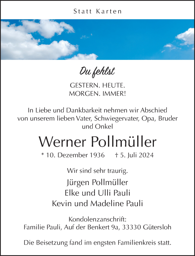 Hier finden Sie alle Traueranzeigen aus der Zeitung, die bisher für Werner Pollmüller erschienen sind. Weitere Traueranzeigen, die in der Zeitung erscheinen, werden hier ebenfalls aufgelistet