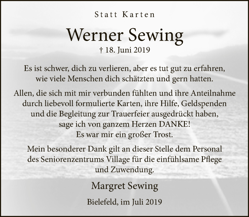 Hier finden Sie alle Traueranzeigen aus der Zeitung, die bisher für Werner Sewing erschienen sind. Weitere Traueranzeigen, die in der Zeitung erscheinen, werden hier ebenfalls aufgelistet