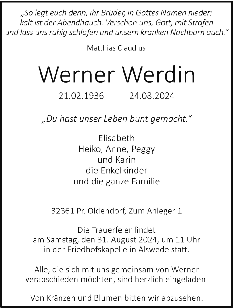 Hier finden Sie alle Traueranzeigen aus der Zeitung, die bisher für Werner Werdin erschienen sind. Weitere Traueranzeigen, die in der Zeitung erscheinen, werden hier ebenfalls aufgelistet