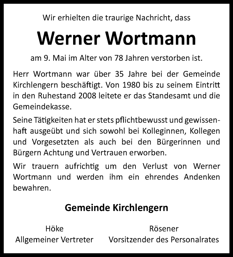 Hier finden Sie alle Traueranzeigen aus der Zeitung, die bisher für Werner Wortmann erschienen sind. Weitere Traueranzeigen, die in der Zeitung erscheinen, werden hier ebenfalls aufgelistet