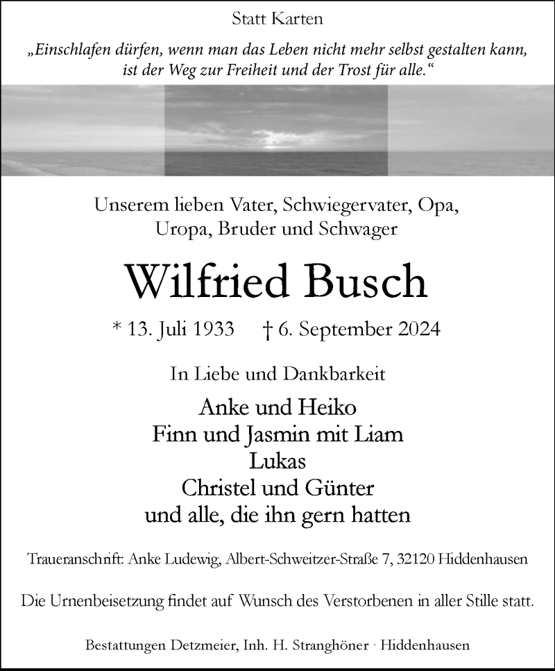 Hier finden Sie alle Traueranzeigen aus der Zeitung, die bisher für Wilfried Busch erschienen sind. Weitere Traueranzeigen, die in der Zeitung erscheinen, werden hier ebenfalls aufgelistet