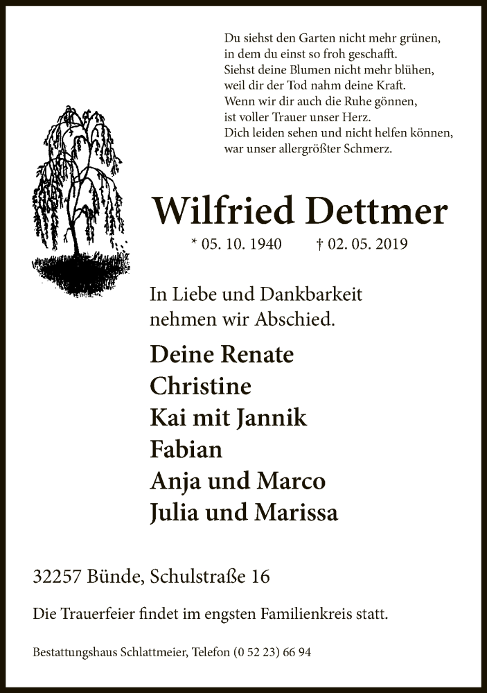 Hier finden Sie alle Traueranzeigen aus der Zeitung, die bisher für Wilfried Dettmer erschienen sind. Weitere Traueranzeigen, die in der Zeitung erscheinen, werden hier ebenfalls aufgelistet