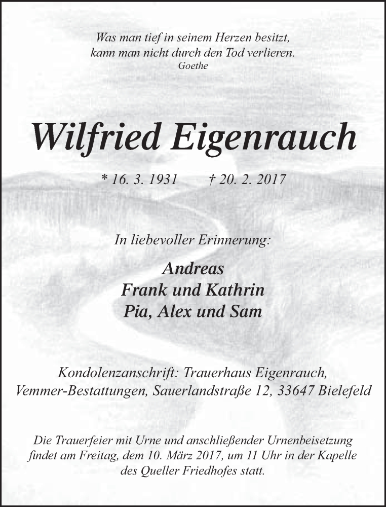 Hier finden Sie alle Traueranzeigen aus der Zeitung, die bisher für Wilfried Eigenrauch erschienen sind. Weitere Traueranzeigen, die in der Zeitung erscheinen, werden hier ebenfalls aufgelistet