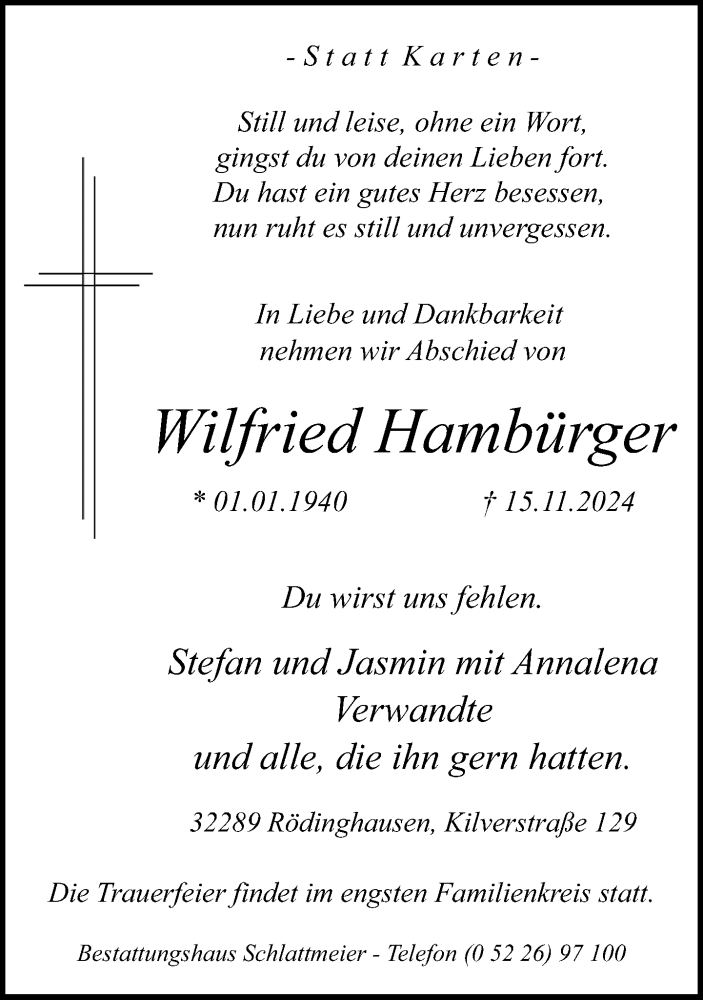 Hier finden Sie alle Traueranzeigen aus der Zeitung, die bisher für Wilfried Hambürger erschienen sind. Weitere Traueranzeigen, die in der Zeitung erscheinen, werden hier ebenfalls aufgelistet