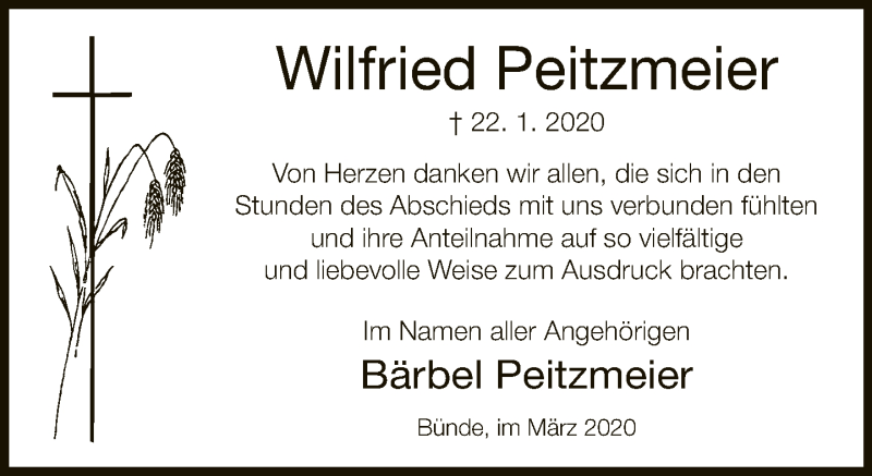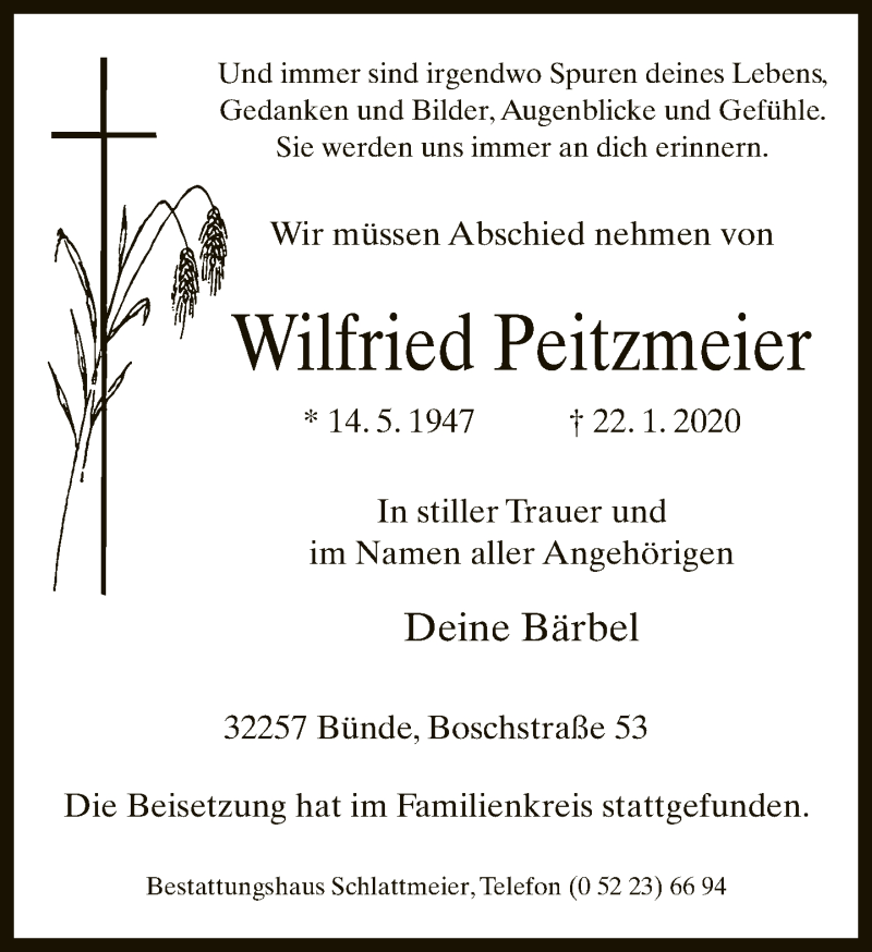 Hier finden Sie alle Traueranzeigen aus der Zeitung, die bisher für Wilfried Peitzmeier erschienen sind. Weitere Traueranzeigen, die in der Zeitung erscheinen, werden hier ebenfalls aufgelistet
