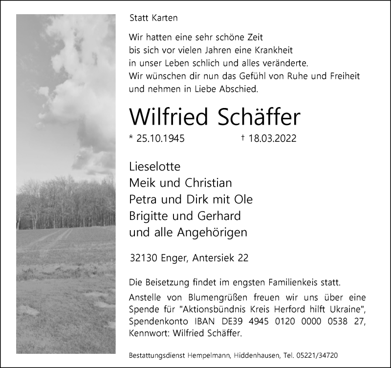 Hier finden Sie alle Traueranzeigen aus der Zeitung, die bisher für Wilfried Schäffer erschienen sind. Weitere Traueranzeigen, die in der Zeitung erscheinen, werden hier ebenfalls aufgelistet