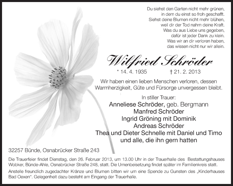 Hier finden Sie alle Traueranzeigen aus der Zeitung, die bisher für Wilfried Schröder erschienen sind. Weitere Traueranzeigen, die in der Zeitung erscheinen, werden hier ebenfalls aufgelistet
