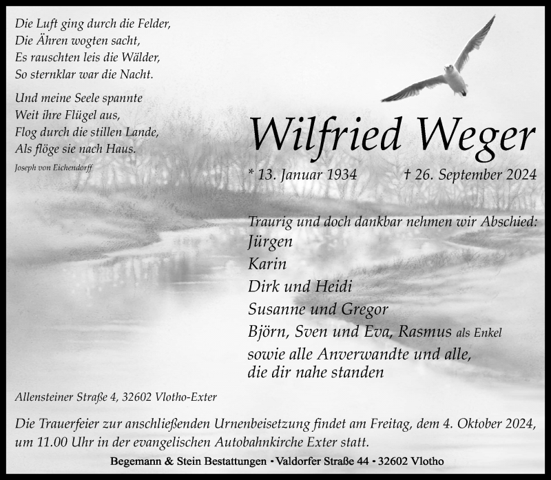 Hier finden Sie alle Traueranzeigen aus der Zeitung, die bisher für Wilfried Weger erschienen sind. Weitere Traueranzeigen, die in der Zeitung erscheinen, werden hier ebenfalls aufgelistet