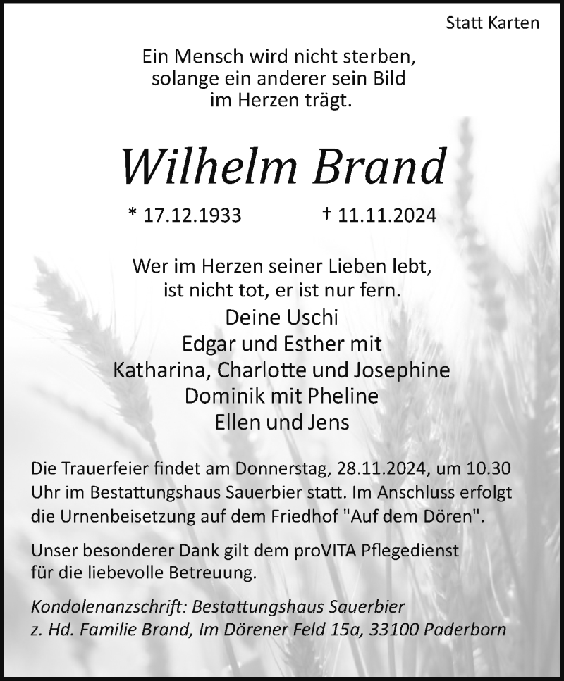 Hier finden Sie alle Traueranzeigen aus der Zeitung, die bisher für Wilhelm Brand erschienen sind. Weitere Traueranzeigen, die in der Zeitung erscheinen, werden hier ebenfalls aufgelistet