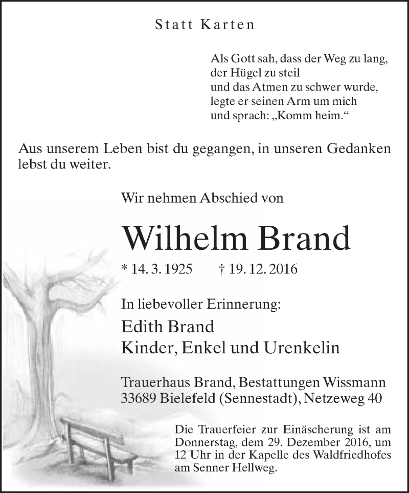 Hier finden Sie alle Traueranzeigen aus der Zeitung, die bisher für Wilhelm Brand erschienen sind. Weitere Traueranzeigen, die in der Zeitung erscheinen, werden hier ebenfalls aufgelistet