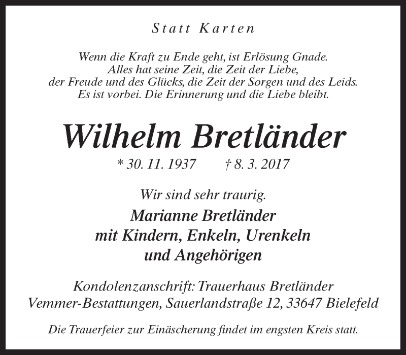 Hier finden Sie alle Traueranzeigen aus der Zeitung, die bisher für Wilhelm Bretländer erschienen sind. Weitere Traueranzeigen, die in der Zeitung erscheinen, werden hier ebenfalls aufgelistet
