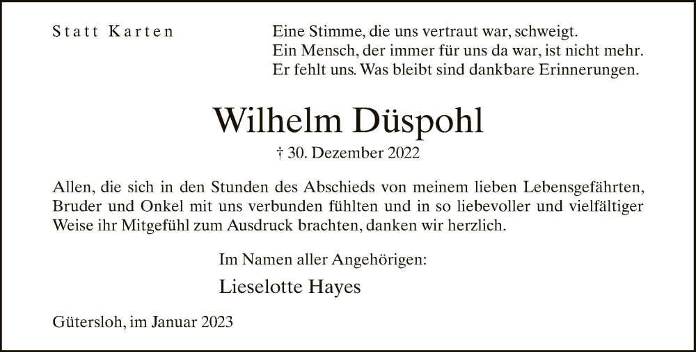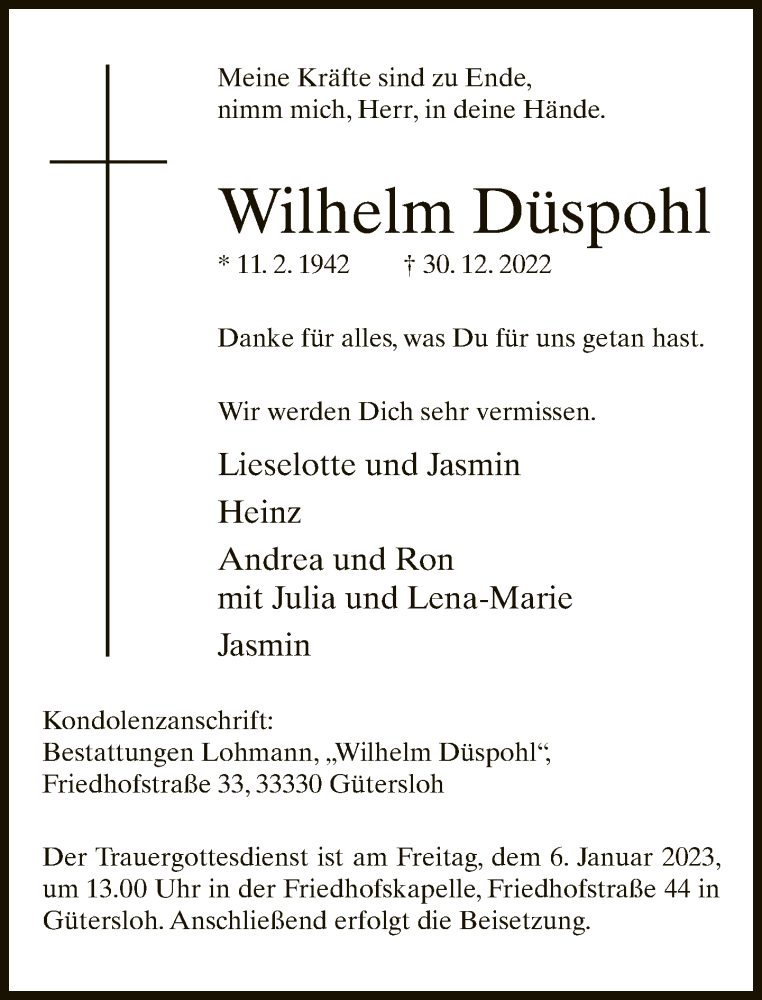 Hier finden Sie alle Traueranzeigen aus der Zeitung, die bisher für Wilhelm Düspohl erschienen sind. Weitere Traueranzeigen, die in der Zeitung erscheinen, werden hier ebenfalls aufgelistet