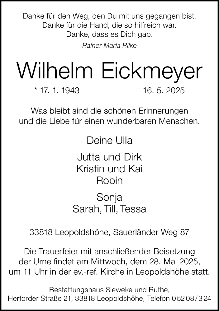 Hier finden Sie alle Traueranzeigen aus der Zeitung, die bisher für Wilhelm Eickmeyer erschienen sind. Weitere Traueranzeigen, die in der Zeitung erscheinen, werden hier ebenfalls aufgelistet