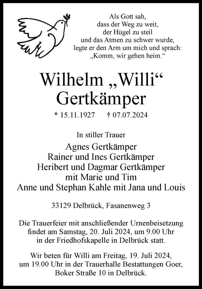 Hier finden Sie alle Traueranzeigen aus der Zeitung, die bisher für Wilhelm Gertkämper erschienen sind. Weitere Traueranzeigen, die in der Zeitung erscheinen, werden hier ebenfalls aufgelistet