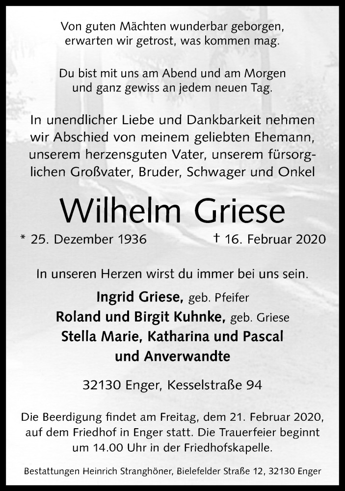 Hier finden Sie alle Traueranzeigen aus der Zeitung, die bisher für Wilhelm Griese erschienen sind. Weitere Traueranzeigen, die in der Zeitung erscheinen, werden hier ebenfalls aufgelistet