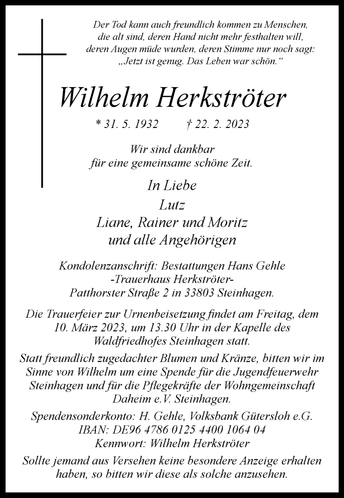 Hier finden Sie alle Traueranzeigen aus der Zeitung, die bisher für Wilhelm Herkströter erschienen sind. Weitere Traueranzeigen, die in der Zeitung erscheinen, werden hier ebenfalls aufgelistet