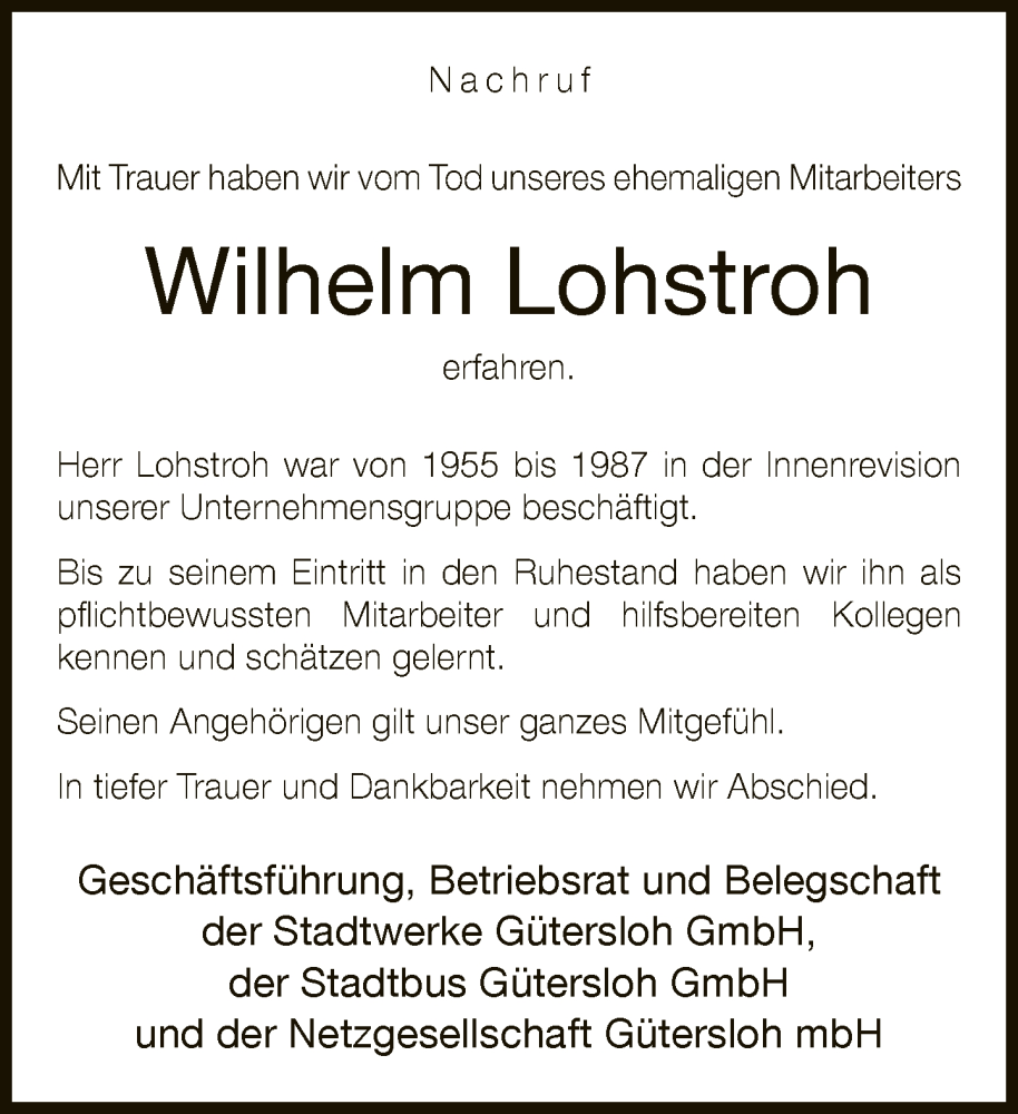 Hier finden Sie alle Traueranzeigen aus der Zeitung, die bisher für Wilhelm Lohstroh erschienen sind. Weitere Traueranzeigen, die in der Zeitung erscheinen, werden hier ebenfalls aufgelistet