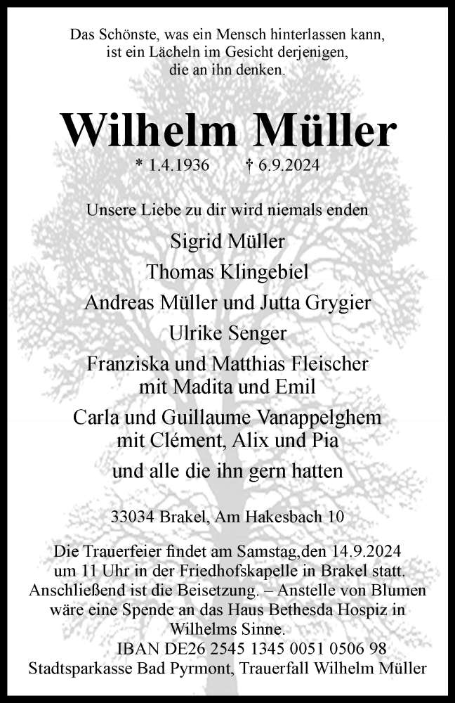 Hier finden Sie alle Traueranzeigen aus der Zeitung, die bisher für Wilhelm Müller erschienen sind. Weitere Traueranzeigen, die in der Zeitung erscheinen, werden hier ebenfalls aufgelistet
