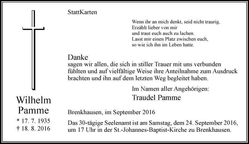 Hier finden Sie alle Traueranzeigen aus der Zeitung, die bisher für Wilhelm Pamme erschienen sind. Weitere Traueranzeigen, die in der Zeitung erscheinen, werden hier ebenfalls aufgelistet