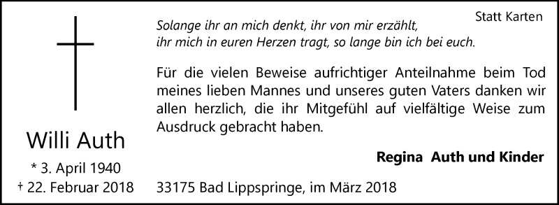 Hier finden Sie alle Traueranzeigen aus der Zeitung, die bisher für Willi Auth erschienen sind. Weitere Traueranzeigen, die in der Zeitung erscheinen, werden hier ebenfalls aufgelistet