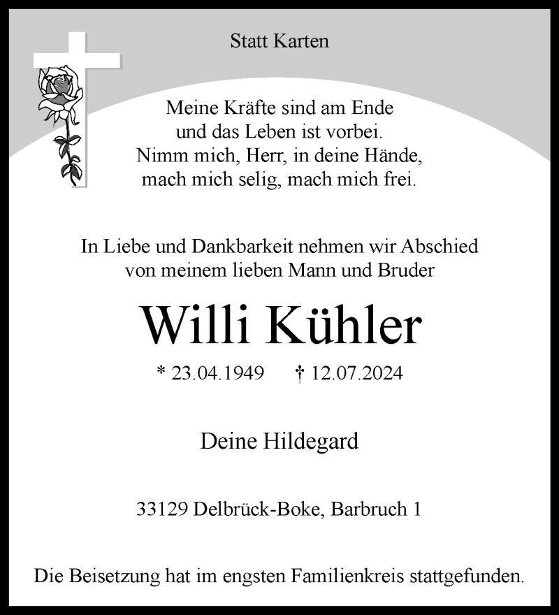 Hier finden Sie alle Traueranzeigen aus der Zeitung, die bisher für Willi Kühler erschienen sind. Weitere Traueranzeigen, die in der Zeitung erscheinen, werden hier ebenfalls aufgelistet