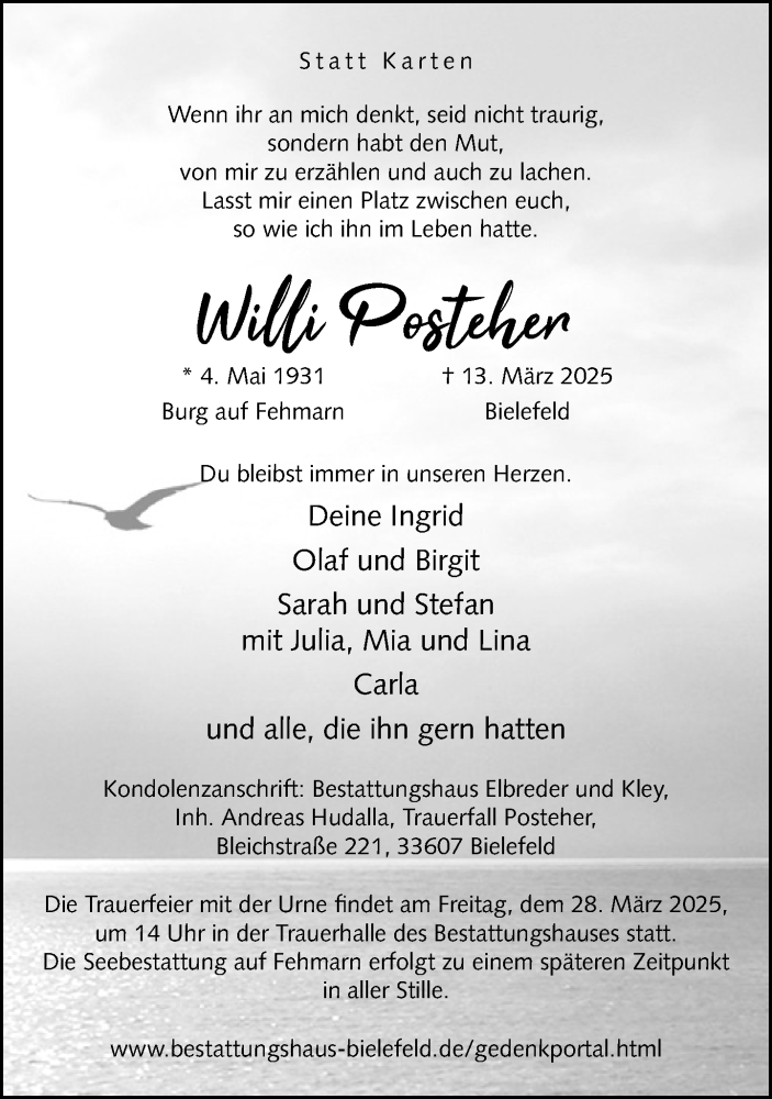 Hier finden Sie alle Traueranzeigen aus der Zeitung, die bisher für Willi Posteher erschienen sind. Weitere Traueranzeigen, die in der Zeitung erscheinen, werden hier ebenfalls aufgelistet
