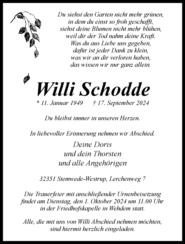 Hier finden Sie alle Traueranzeigen aus der Zeitung, die bisher für Willi Schodde erschienen sind. Weitere Traueranzeigen, die in der Zeitung erscheinen, werden hier ebenfalls aufgelistet