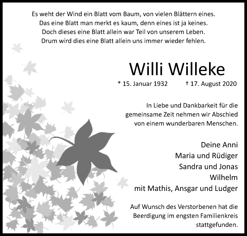 Hier finden Sie alle Traueranzeigen aus der Zeitung, die bisher für Willi Willeke erschienen sind. Weitere Traueranzeigen, die in der Zeitung erscheinen, werden hier ebenfalls aufgelistet
