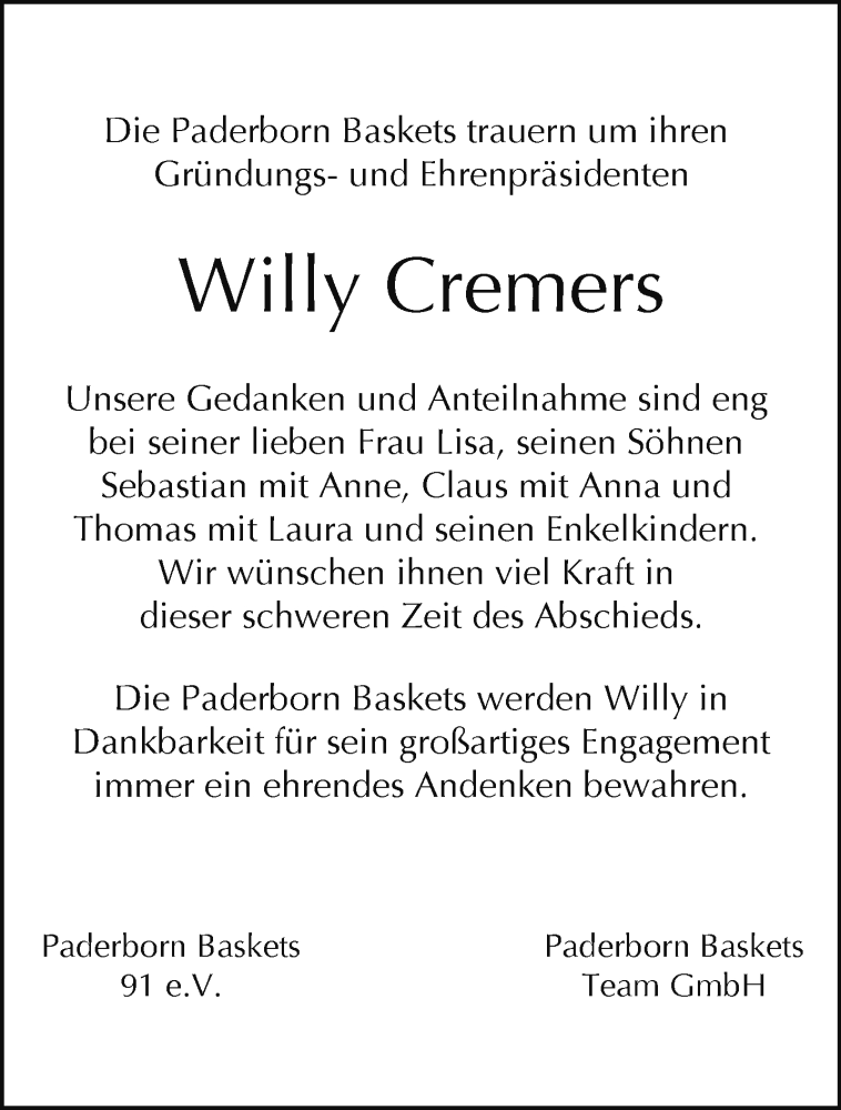 Hier finden Sie alle Traueranzeigen aus der Zeitung, die bisher für Willy Cremers erschienen sind. Weitere Traueranzeigen, die in der Zeitung erscheinen, werden hier ebenfalls aufgelistet