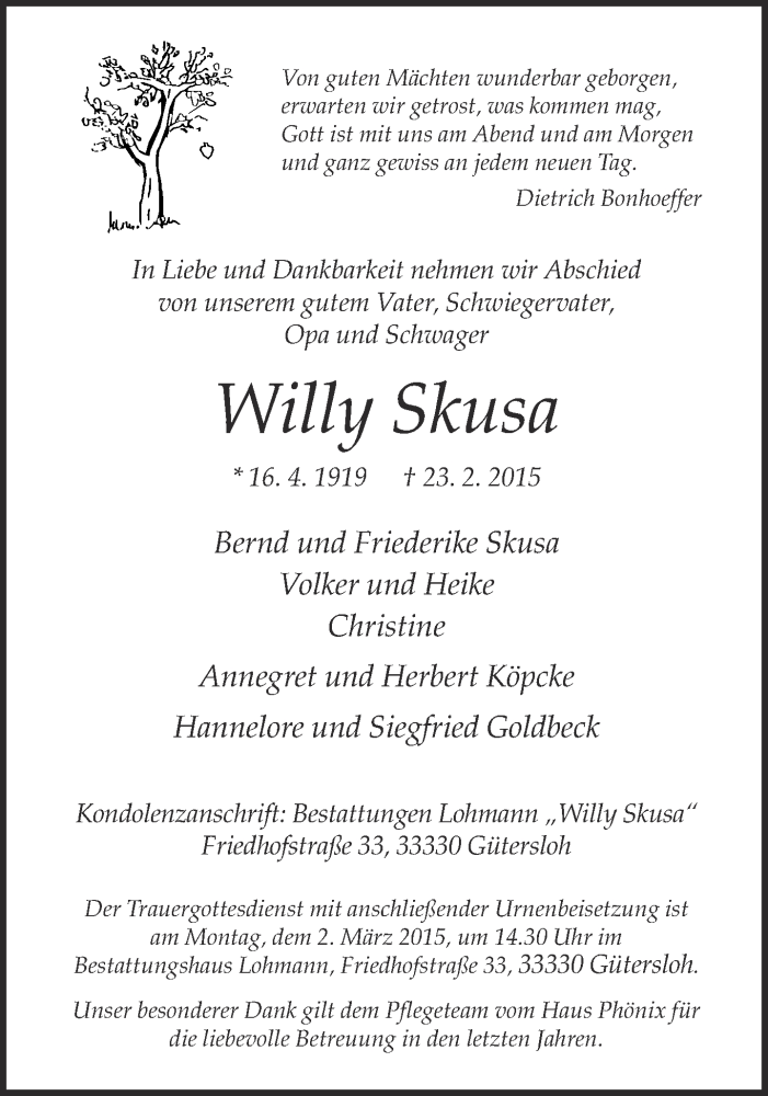 Hier finden Sie alle Traueranzeigen aus der Zeitung, die bisher für Willy Skusa erschienen sind. Weitere Traueranzeigen, die in der Zeitung erscheinen, werden hier ebenfalls aufgelistet