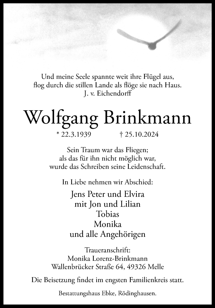 Hier finden Sie alle Traueranzeigen aus der Zeitung, die bisher für Wolfgang Brinkmann erschienen sind. Weitere Traueranzeigen, die in der Zeitung erscheinen, werden hier ebenfalls aufgelistet