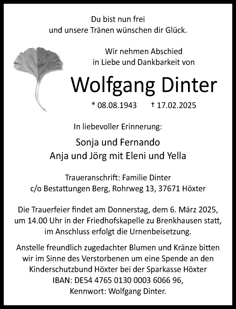 Hier finden Sie alle Traueranzeigen aus der Zeitung, die bisher für Wolfgang Dinter erschienen sind. Weitere Traueranzeigen, die in der Zeitung erscheinen, werden hier ebenfalls aufgelistet