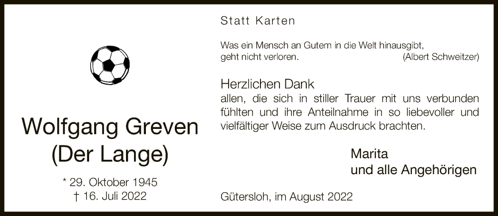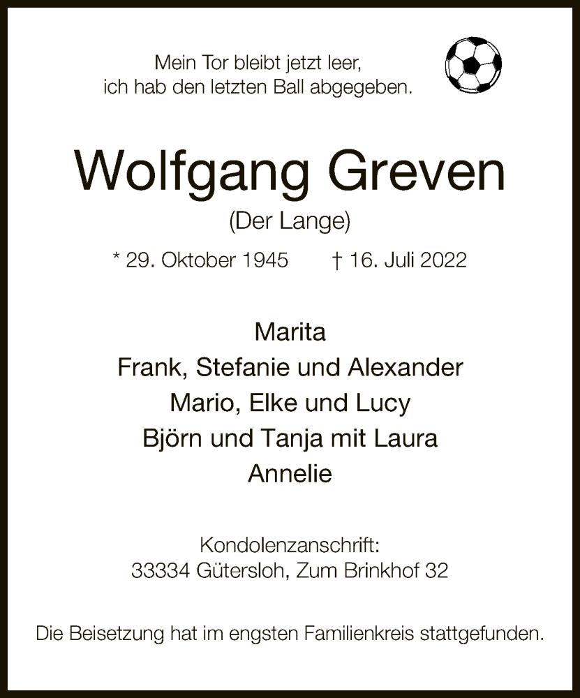 Hier finden Sie alle Traueranzeigen aus der Zeitung, die bisher für Wolfgang Greven erschienen sind. Weitere Traueranzeigen, die in der Zeitung erscheinen, werden hier ebenfalls aufgelistet