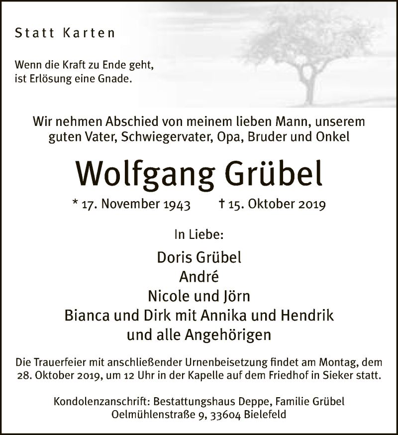 Hier finden Sie alle Traueranzeigen aus der Zeitung, die bisher für Wolfgang Grübet erschienen sind. Weitere Traueranzeigen, die in der Zeitung erscheinen, werden hier ebenfalls aufgelistet