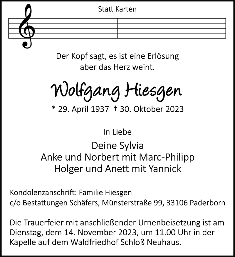 Hier finden Sie alle Traueranzeigen aus der Zeitung, die bisher für Wolfgang Hiesgen erschienen sind. Weitere Traueranzeigen, die in der Zeitung erscheinen, werden hier ebenfalls aufgelistet