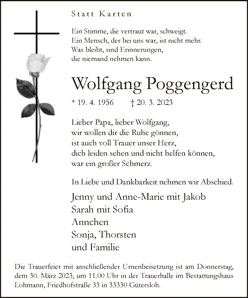 Hier finden Sie alle Traueranzeigen aus der Zeitung, die bisher für Wolfgang Poggengerd erschienen sind. Weitere Traueranzeigen, die in der Zeitung erscheinen, werden hier ebenfalls aufgelistet