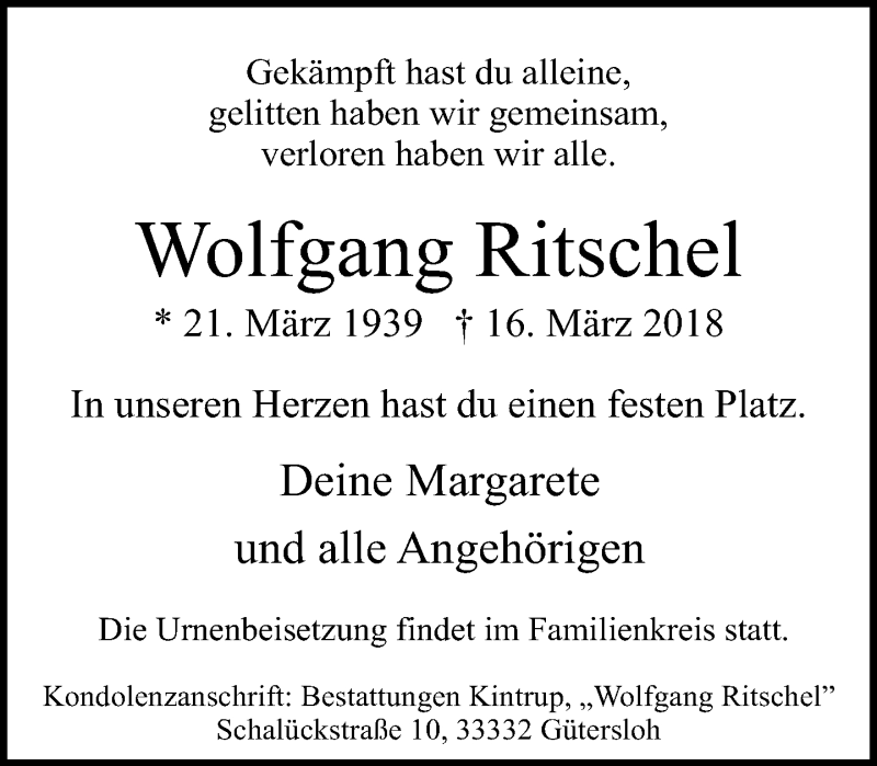 Hier finden Sie alle Traueranzeigen aus der Zeitung, die bisher für Wolfgang Ritschel erschienen sind. Weitere Traueranzeigen, die in der Zeitung erscheinen, werden hier ebenfalls aufgelistet