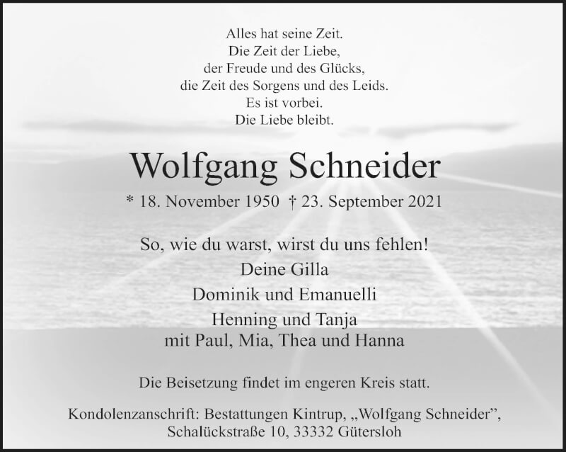Hier finden Sie alle Traueranzeigen aus der Zeitung, die bisher für Wolfgang Schneider erschienen sind. Weitere Traueranzeigen, die in der Zeitung erscheinen, werden hier ebenfalls aufgelistet