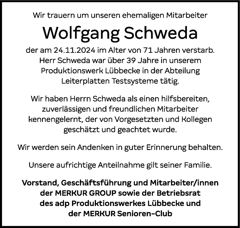 Hier finden Sie alle Traueranzeigen aus der Zeitung, die bisher für Wolfgang Schweda erschienen sind. Weitere Traueranzeigen, die in der Zeitung erscheinen, werden hier ebenfalls aufgelistet