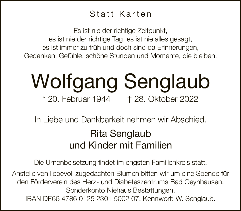 Hier finden Sie alle Traueranzeigen aus der Zeitung, die bisher für Wolfgang Senglaub erschienen sind. Weitere Traueranzeigen, die in der Zeitung erscheinen, werden hier ebenfalls aufgelistet